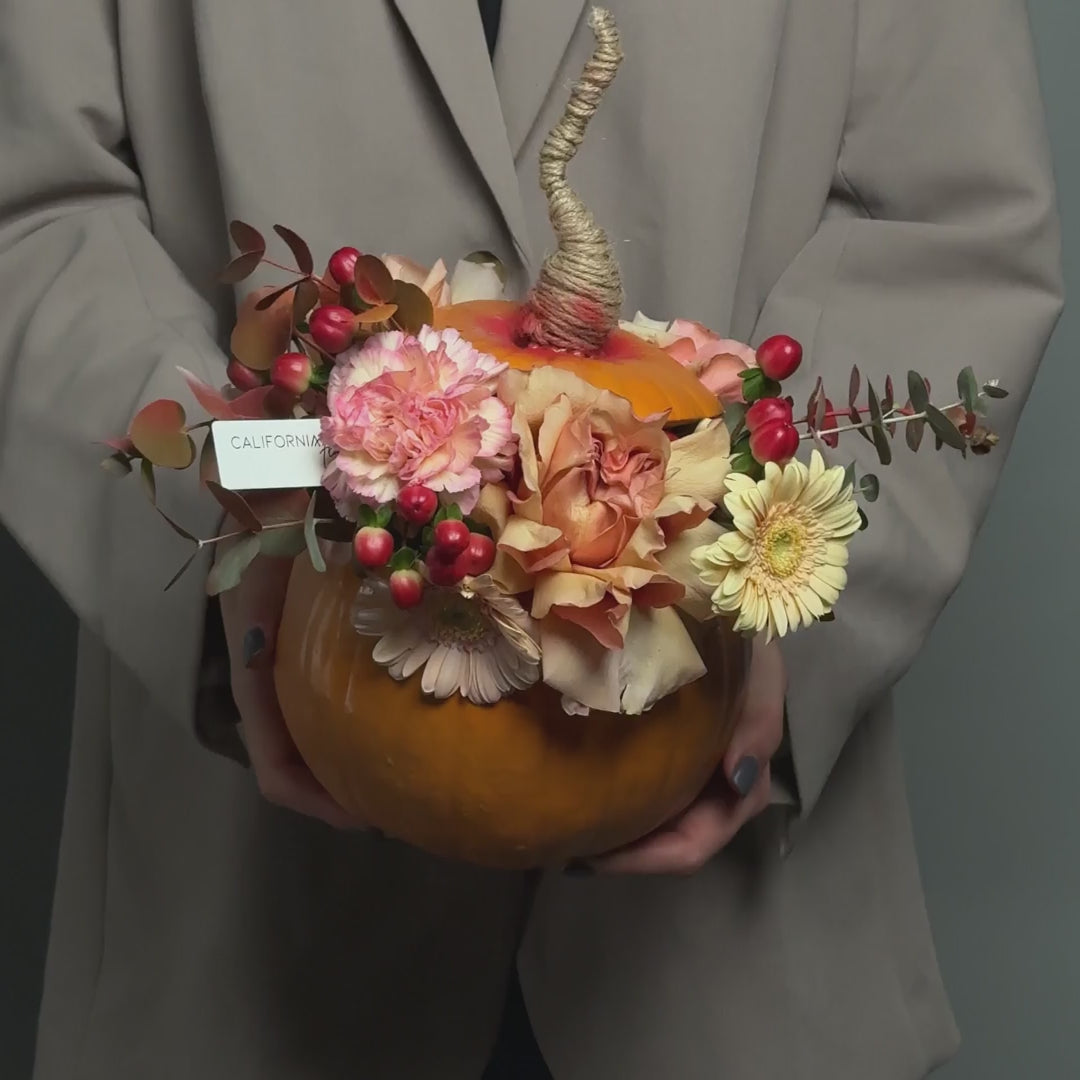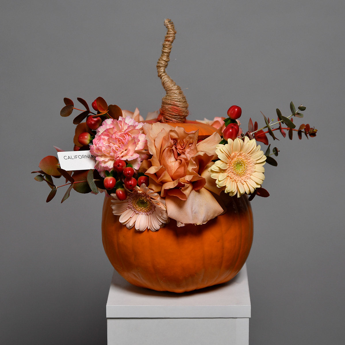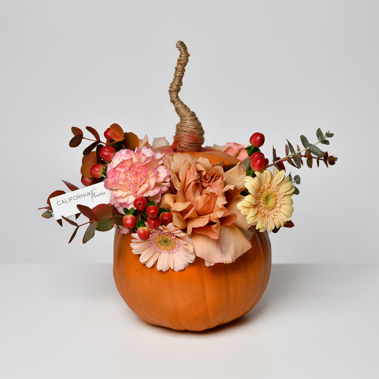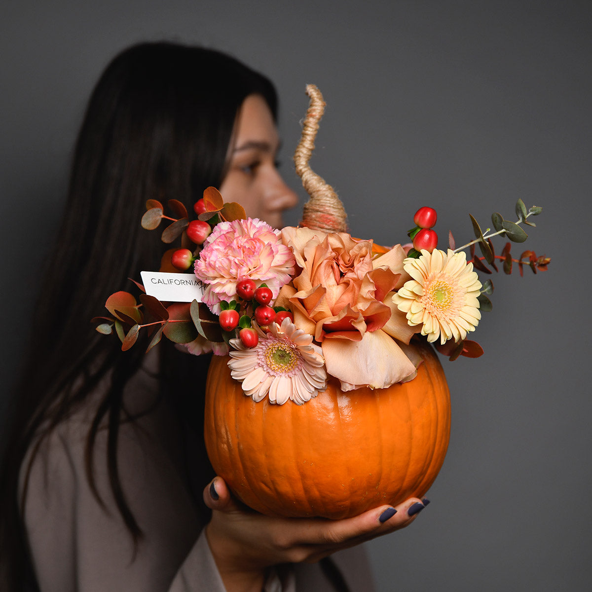 INTRETINERE Aranajemnt floral in dovleac cu gerbera si hypericum