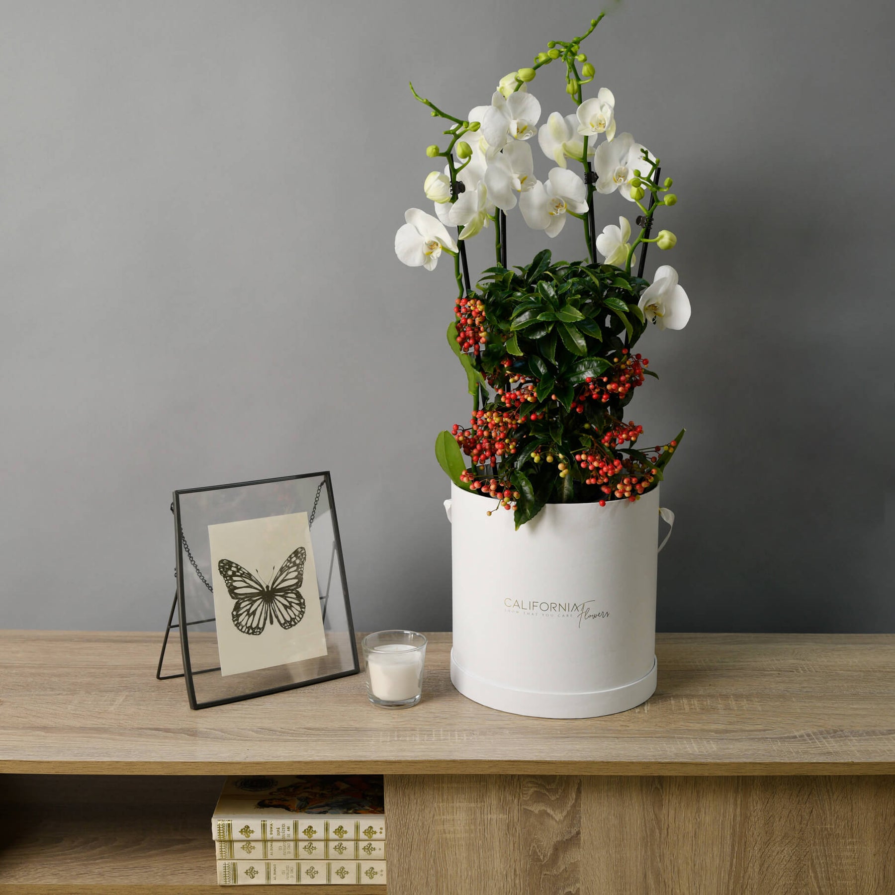 Descriere produs: Un aranjament elegant într-o cutie premium, ce îmbină frumusețea orhideelor Phalaenopsis cu fructele decorative ale plantei Ardisia. O compoziție rafinată și modernă, perfectă pentru cadouri speciale sau decor deosebit.