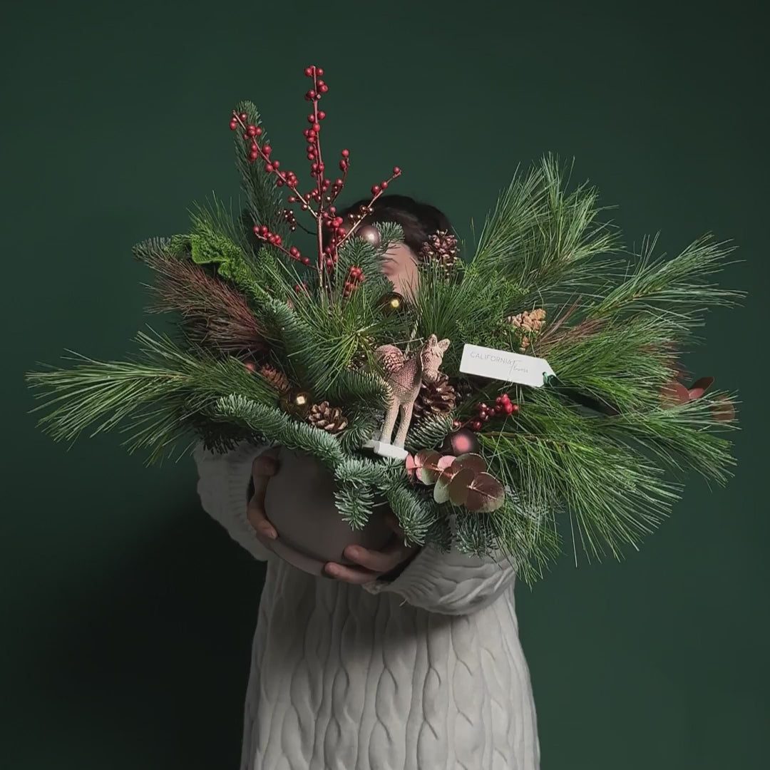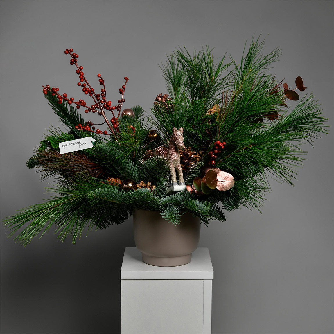 Reteta produs: ghiveci 60 *1, burete *1, ilex *1, decoratiune 45 *1, creanga brad *3, pin *3, tuia *2, eucalipt *2, con brad *5, glob S (maro) *3