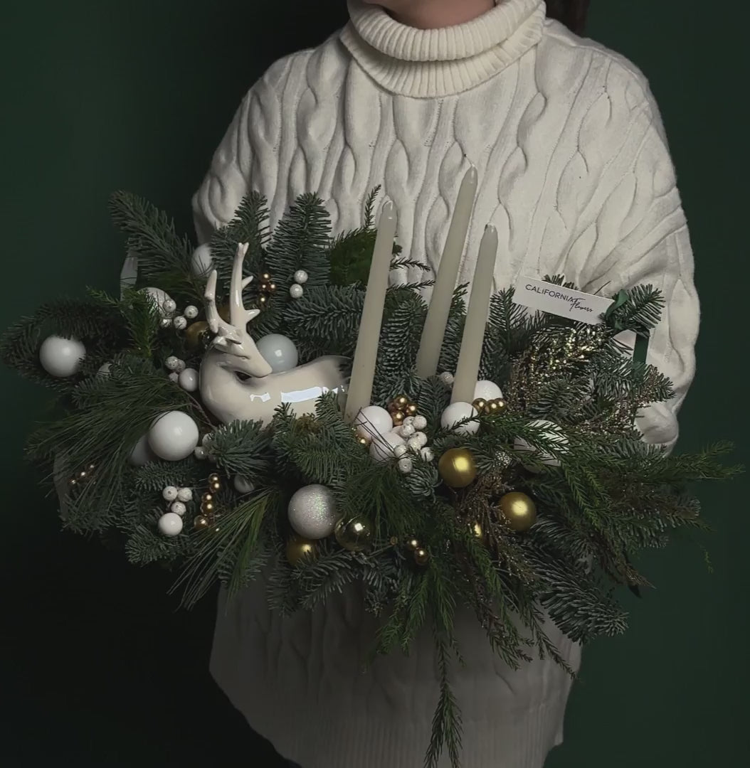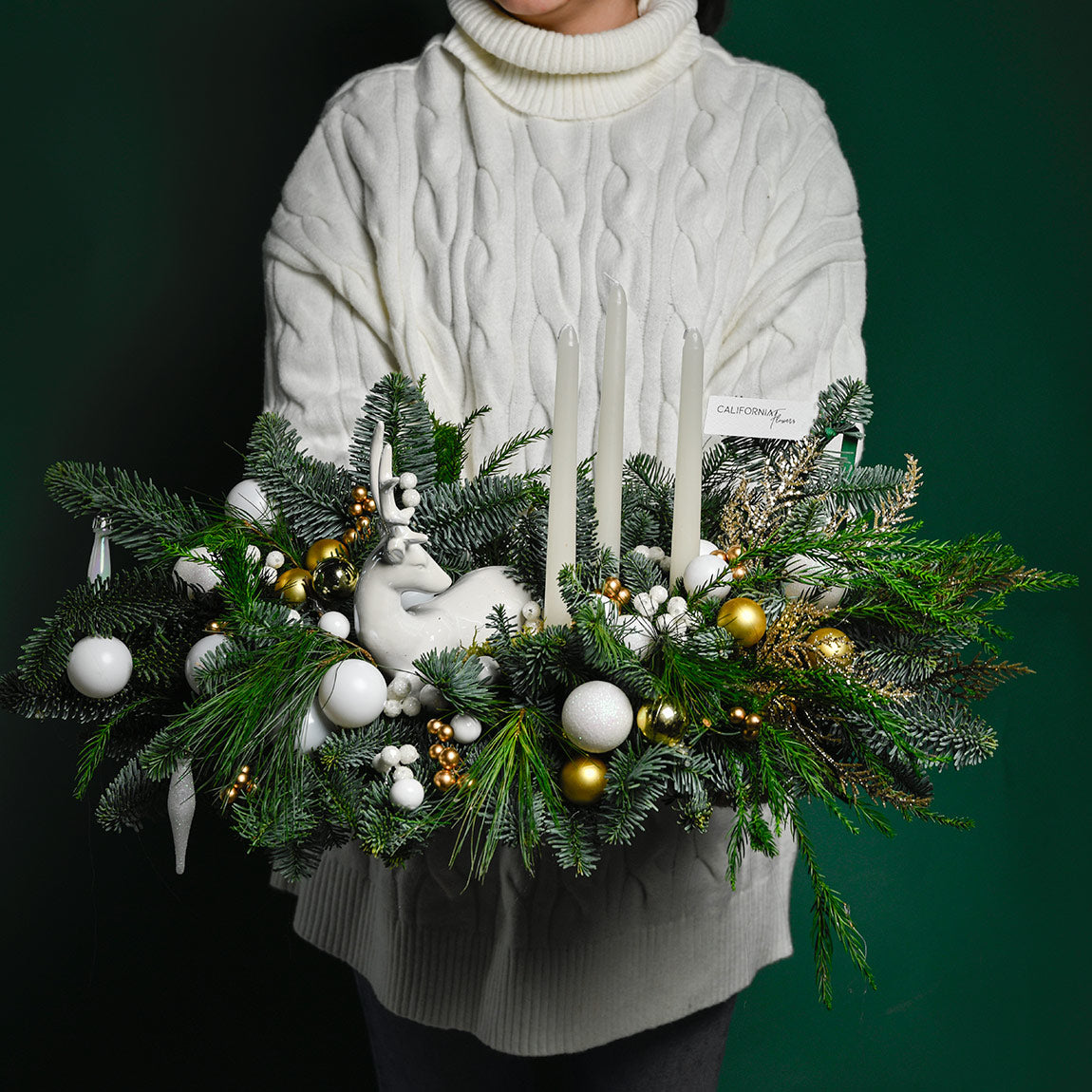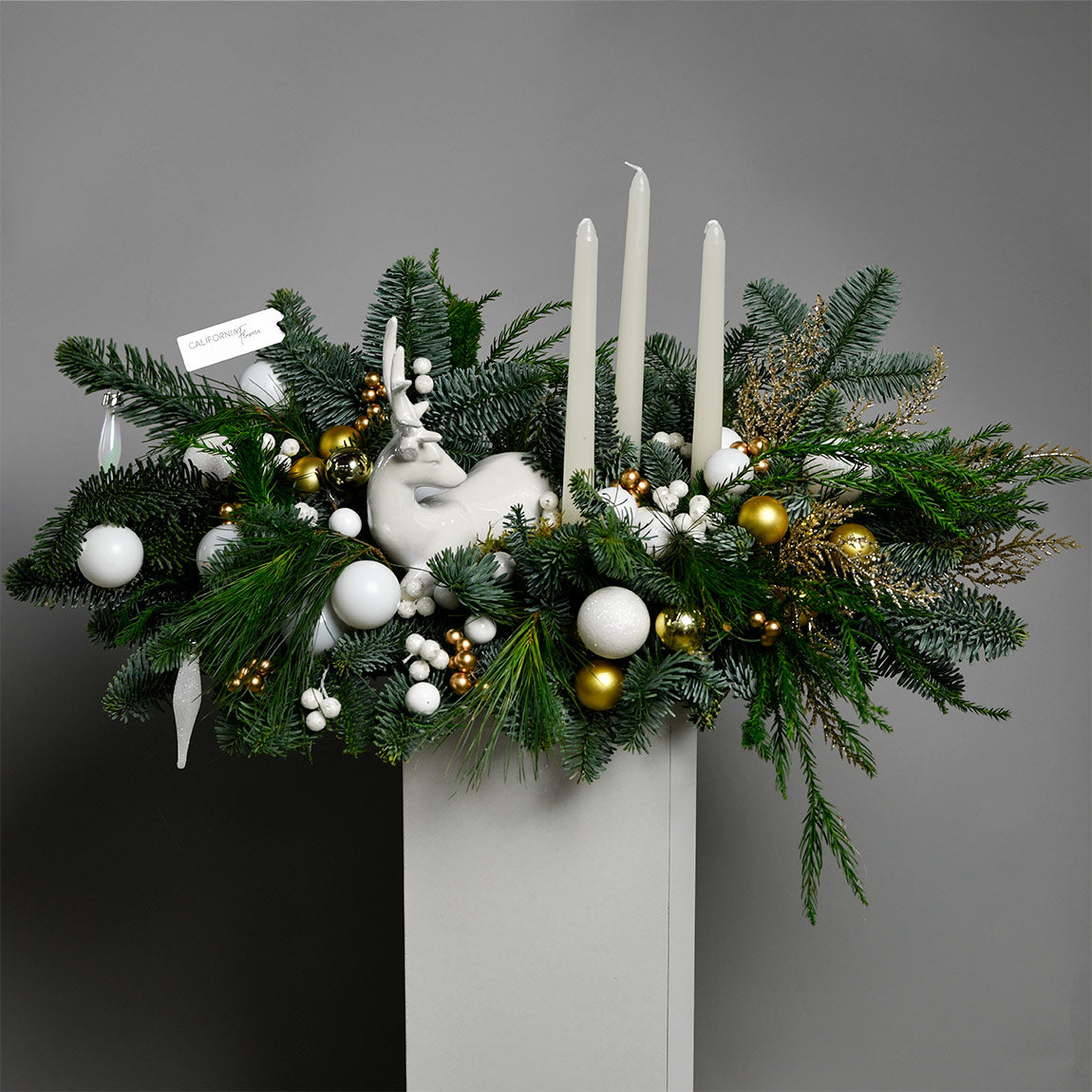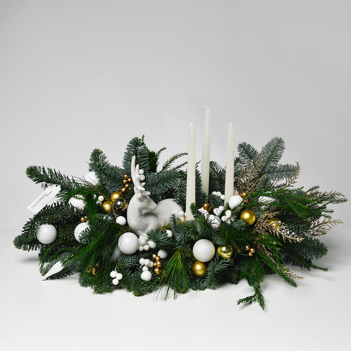 Reteta produs: tava burete *1, burete *1, decoratiune ceramica 45 (cerb) *1, lumanare (alb) *3, creanga brad *4, pin *3, glob S (alb) *10, glob XS (auriu) *8, glob XS (alb) *10, bobite (albe) *30, bobite (aurii) *20, decoratiune uscata 10 (auriu) *3