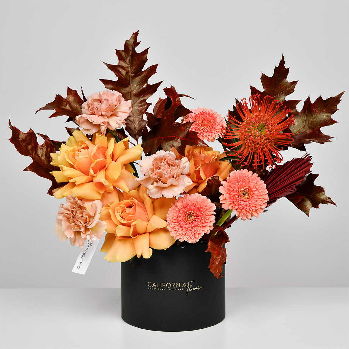INTRETINERE Aranjament floral in cutie cu leucadendron, trandafiri si gerbera