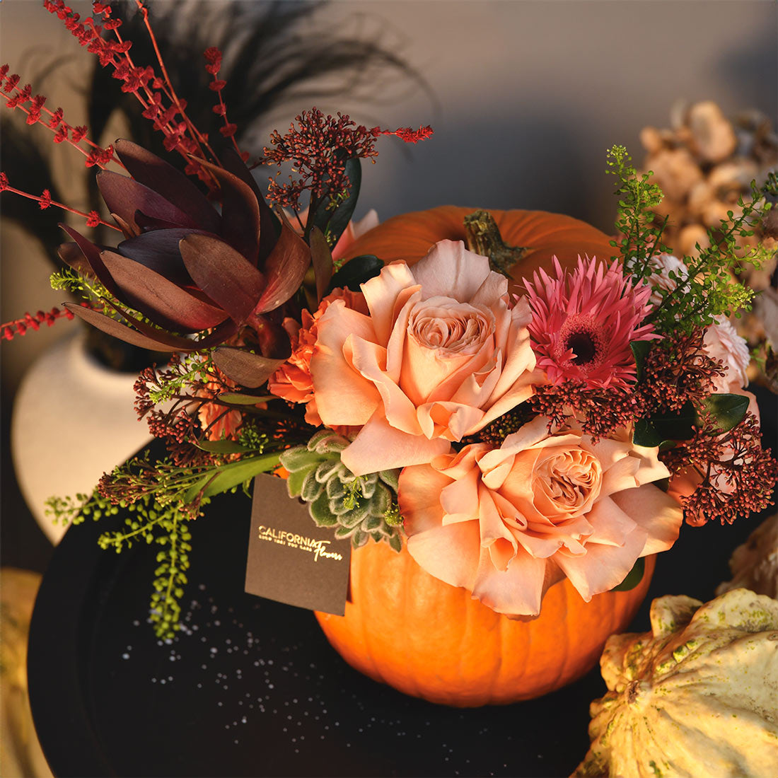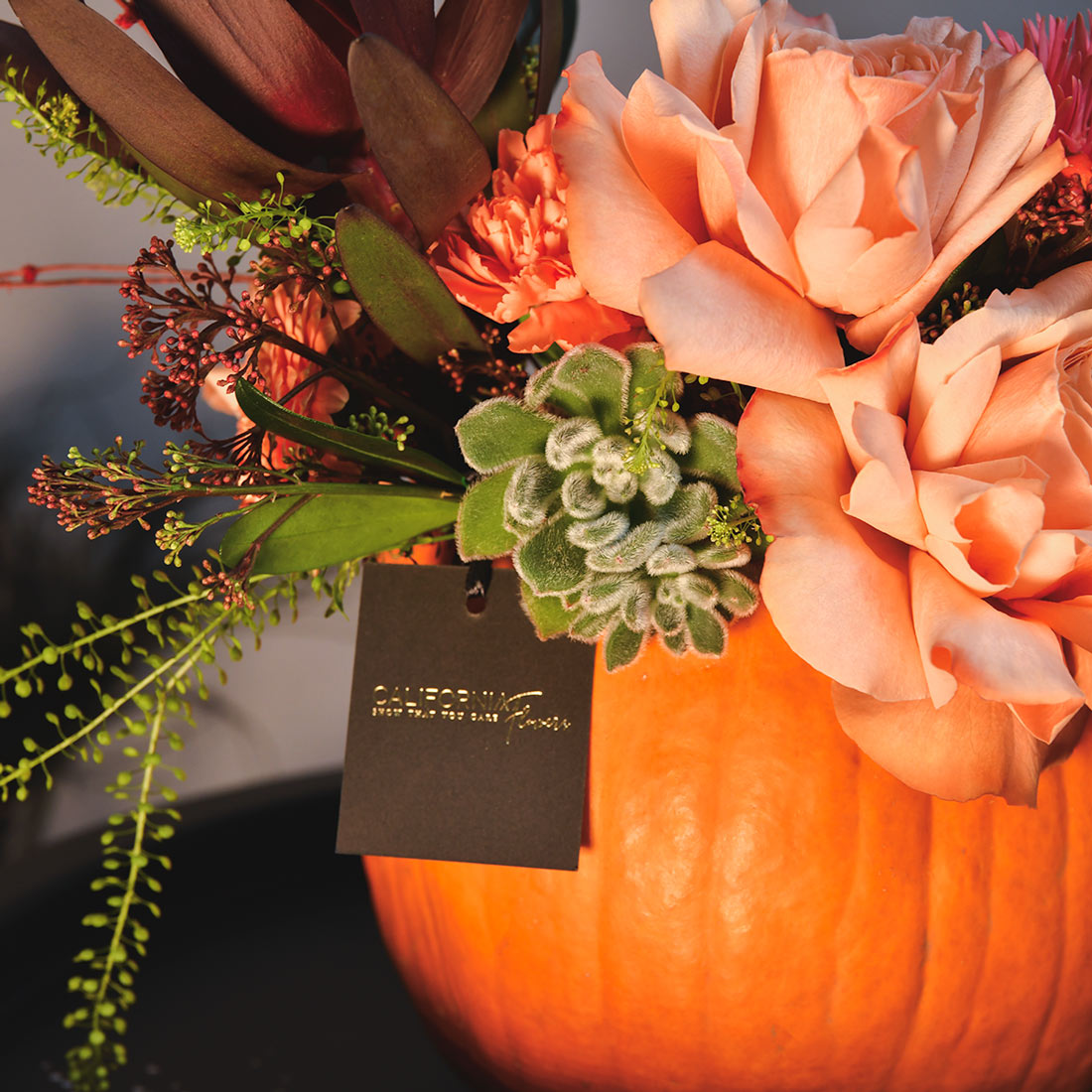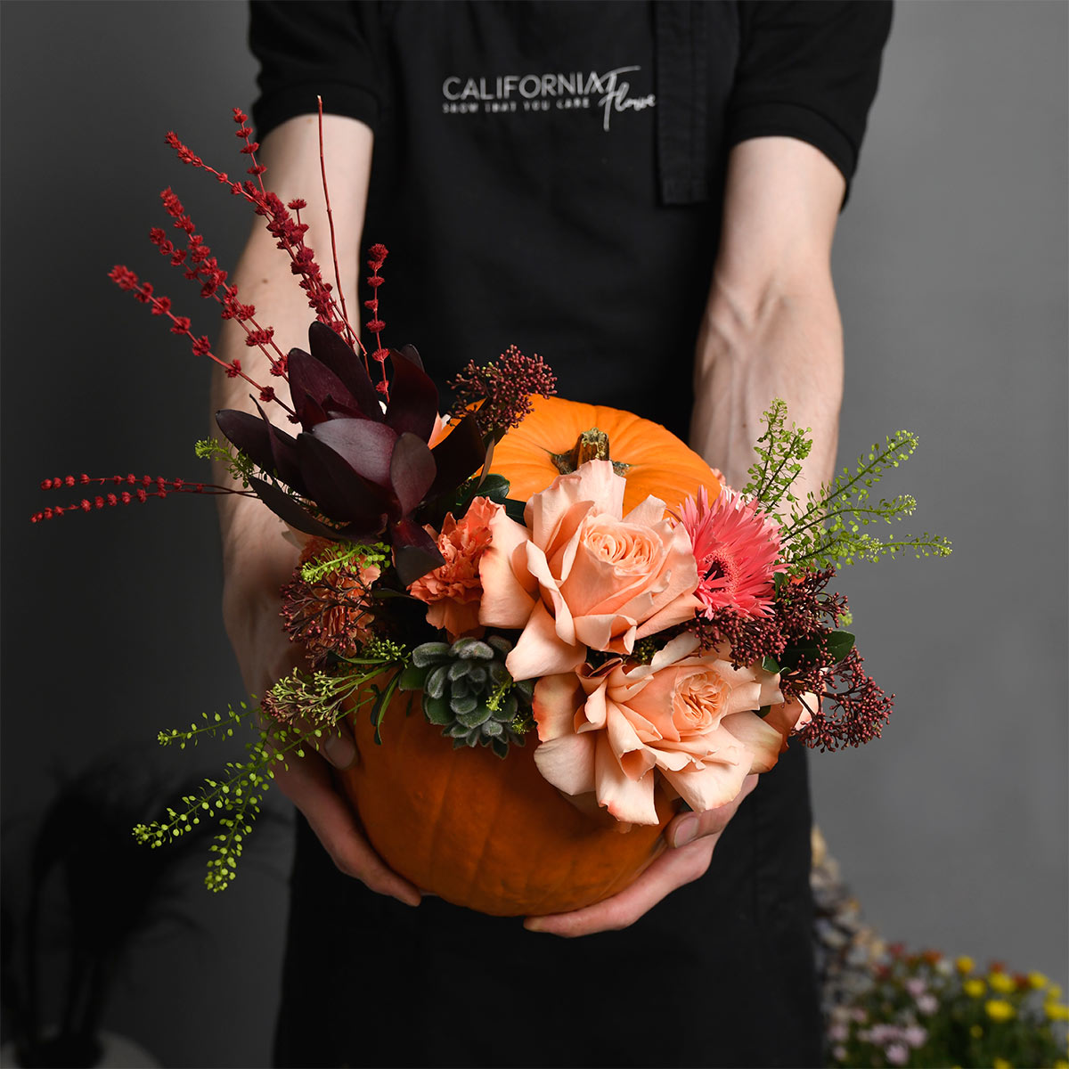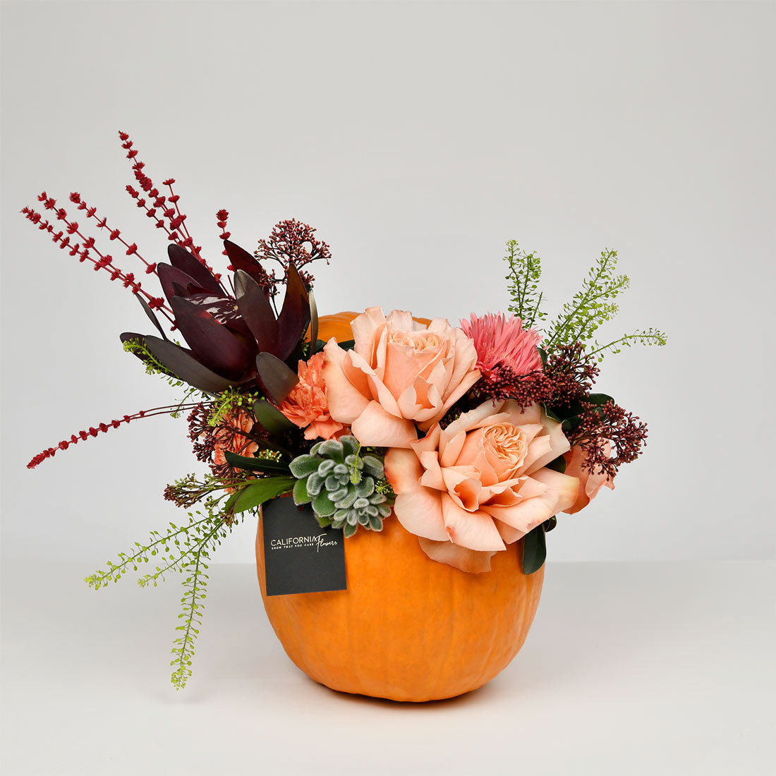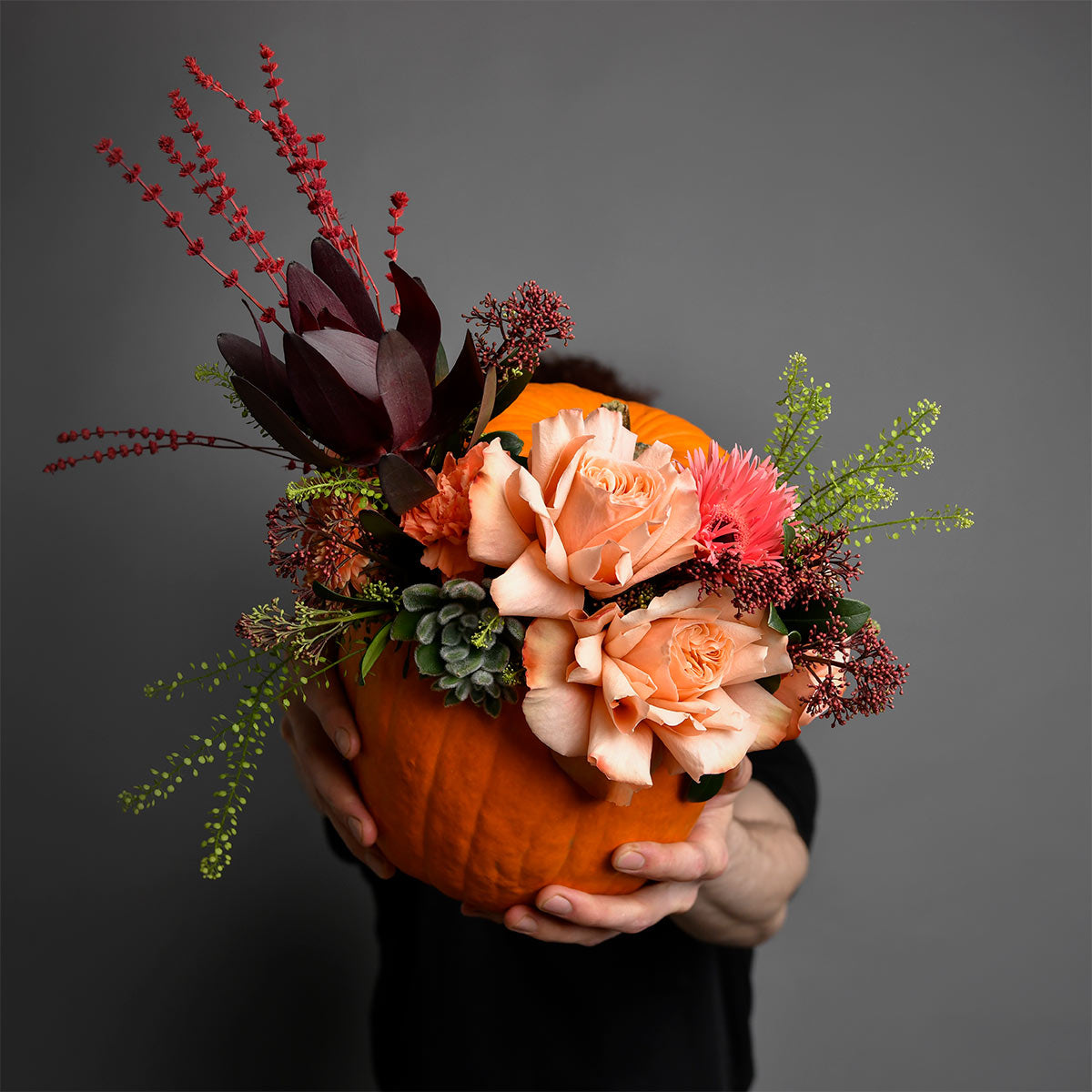 INTRETINERE Aranjament floral in dovleac cu trandafiri speciali somon, suculent si leucadendron