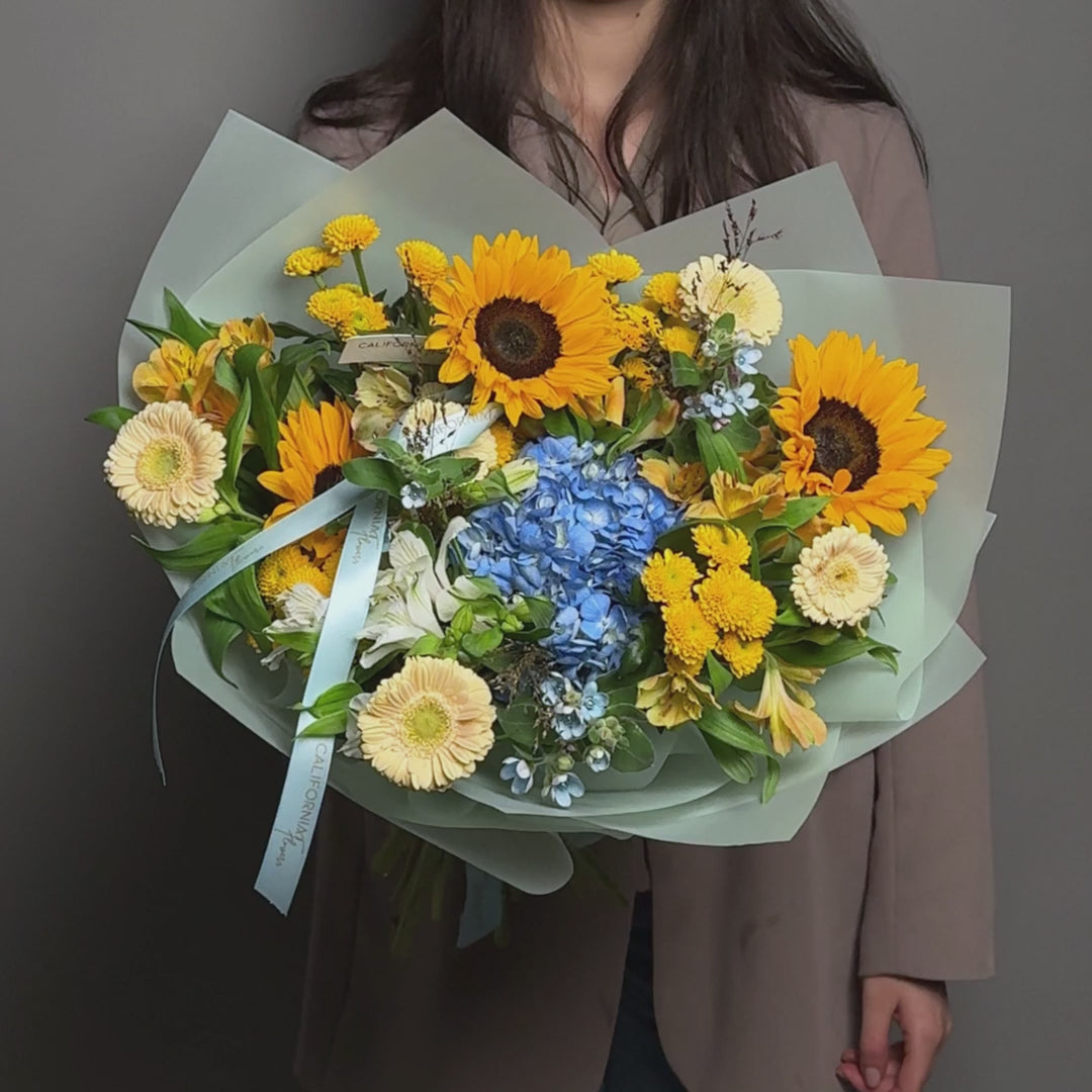 Reteta produs: hortensie (albastra) *1, floarea soarelui *3, gerbera (somon) *5, santini (galben) *4, alstroemeria (galben) *3, alstroemeria (alb) *3, oxypetal *3, panicum *2, ambalaj *4