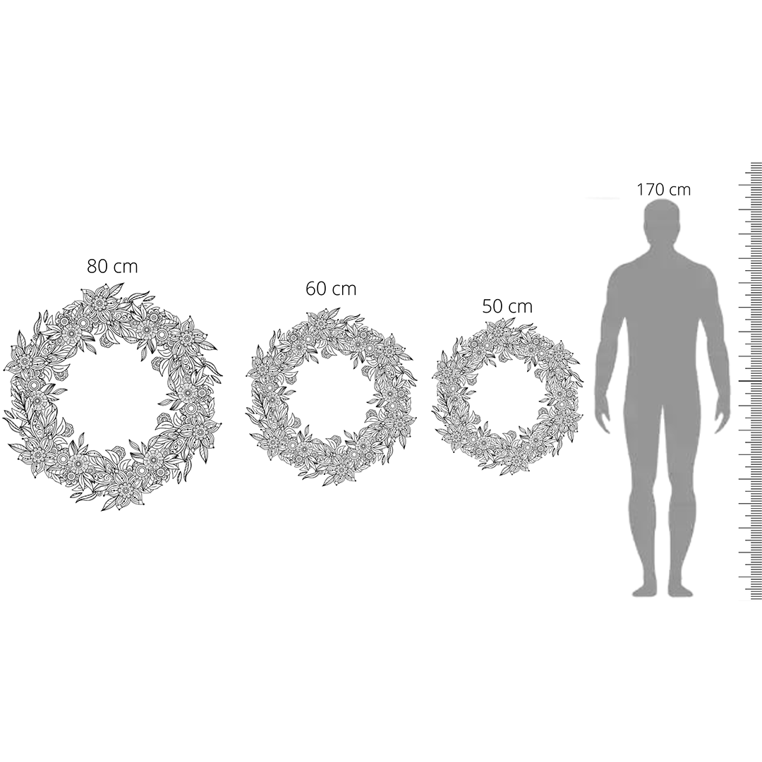 Reteta produs: [var 50cm] suport coroana 50 *1, aspidistra *12, pistacia *30, trandafir (rosu) *4, crizantema (alba) *5, eryngium (verde) *2, eucalipt *2, pittosporum *3 [var 60cm] suport coroana 50 *1, aspidistra *12, pistacia *30, trandafir (rosu) *6, crizantema (alba) *7, eryngium (verde) *4, eucalipt *2, pittosporum *3 [var 80cm] suport coroana 80 *1, aspidistra *20, pistacia *50, trandafir (rosu) *10, crizantema (alba) *10, eryngium (verde) *4, eucalipt *2, pittosporum *3