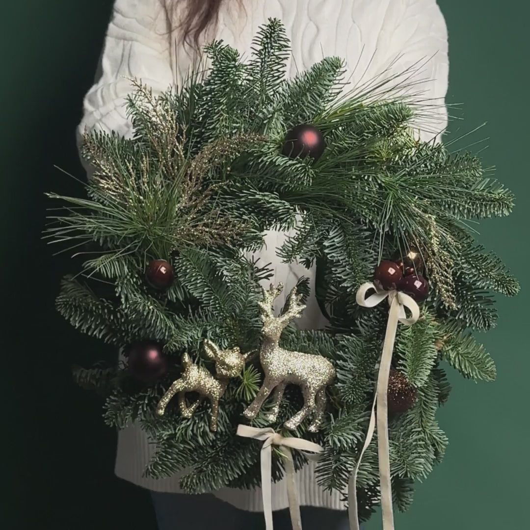 Reteta produs: creanga brad *2, pin *2, suport coronita mare *1, decoratiune ceramica 45 *1, decoratiune uscata (fundite) *2, glob XS (maro) *4, glob S (maro) *3, decoratiune uscata (frunza aurie) *1
