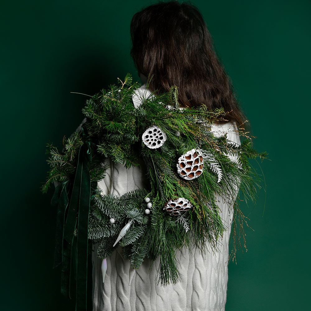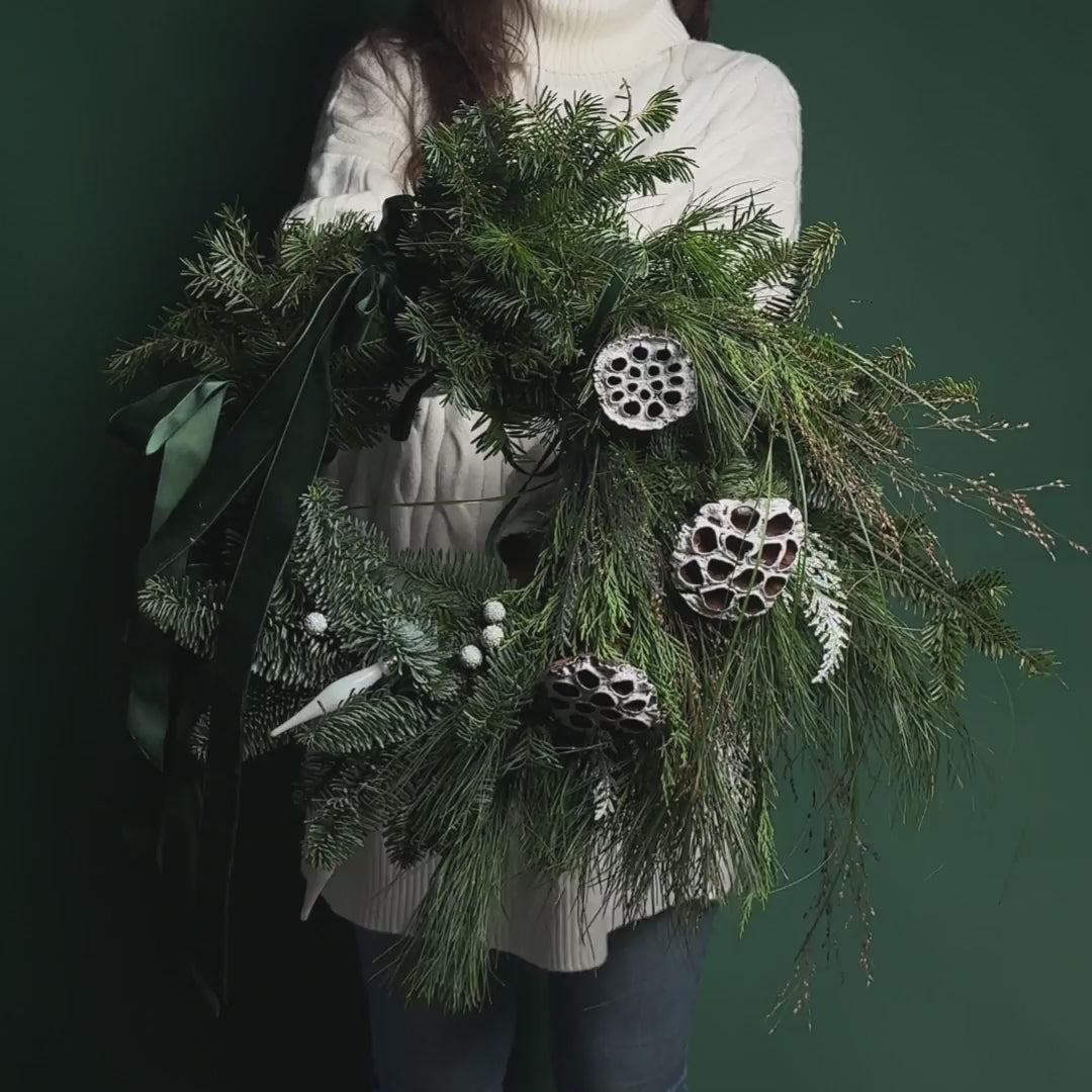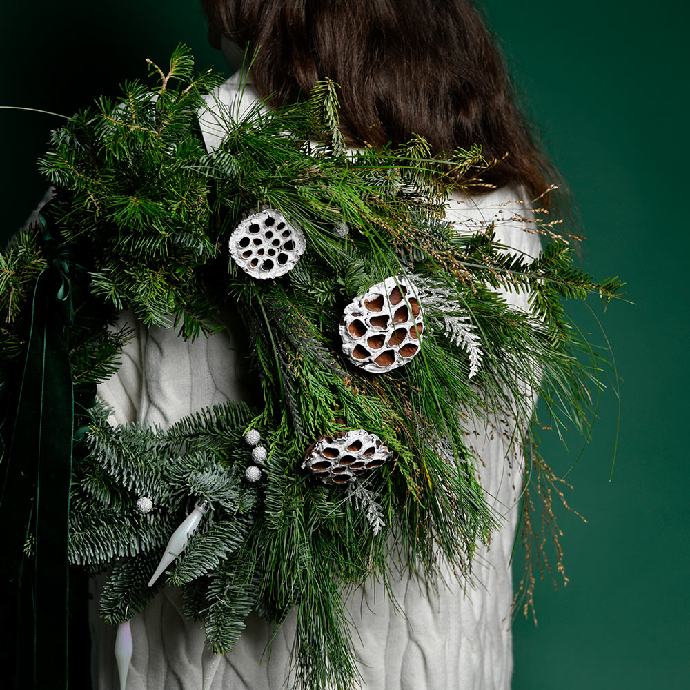 Reteta produs: creanga brad *2, pin *3, tuia *2, beargras *4, oanicum *3, lotus *3, decoratiune uscata 5 (turturi) *3, decoratiune uscata 10 (frunza aurie) *3, bobite (argintii) *5
