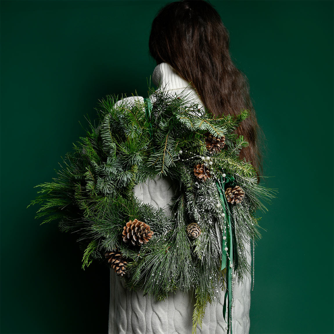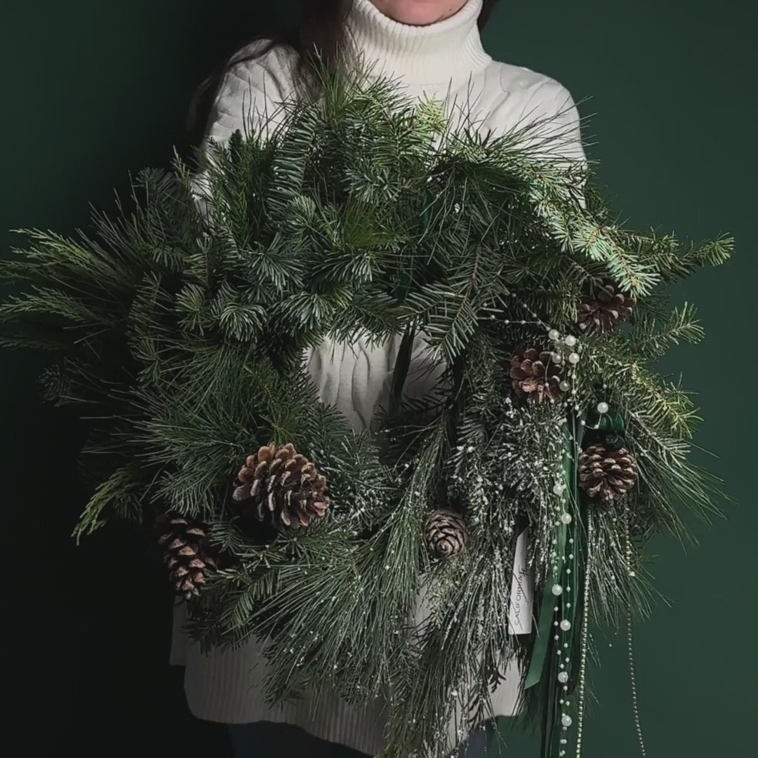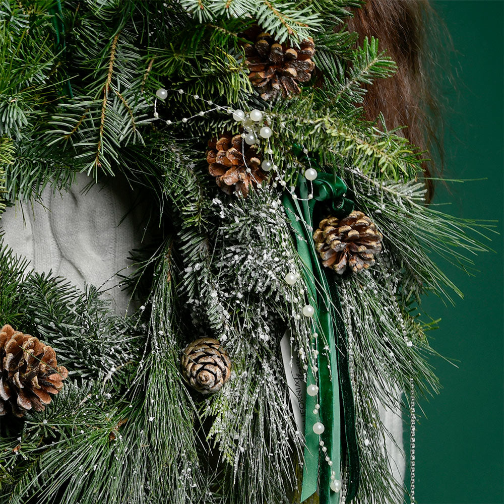 Reteta produs: creanga brad *3, suport coronita mic *1, pin *2, tuia *2, con brad *6, decoratiune uscata (fundita) *2, decoratiune uscata 10 (lant perle si lant argintiu) *2